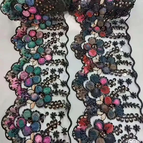 3D Mesh ပန်းများ ဖဲကြိုး ပုတီးစေ့များဖြင့် ရောင်စုံပန်းထိုး ဇာထိုး ဘားကုဒ်ပန်းထိုးဇာ